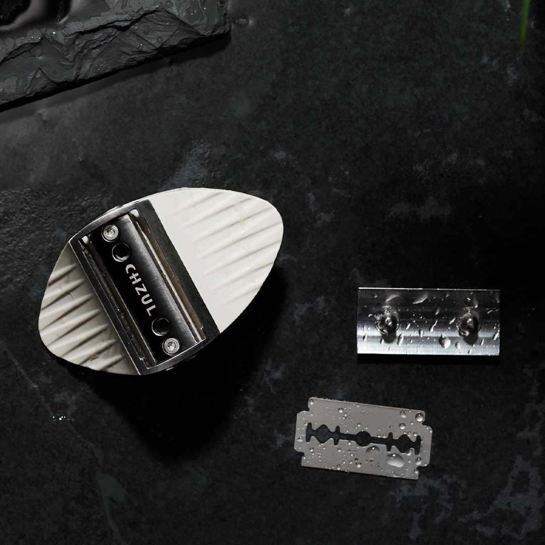 Ergonomic head shaver for bump-prone skin using a single DE steel edge for cleaner results and confident control.