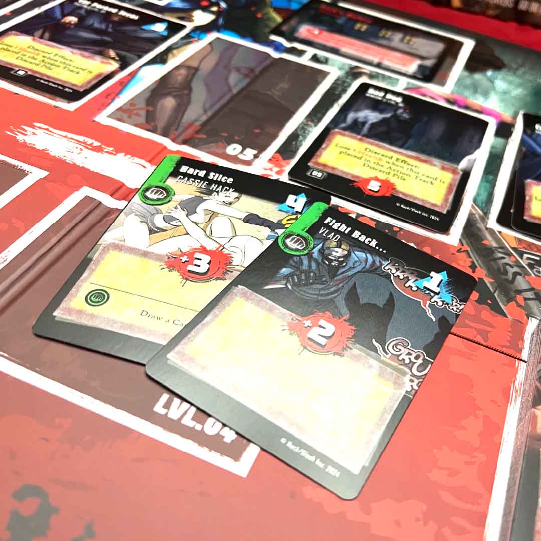 Hunt Slashers, not players. 1-6 player co-op deckbuilder as Cassie & Vlad. Defeat four villains to win.