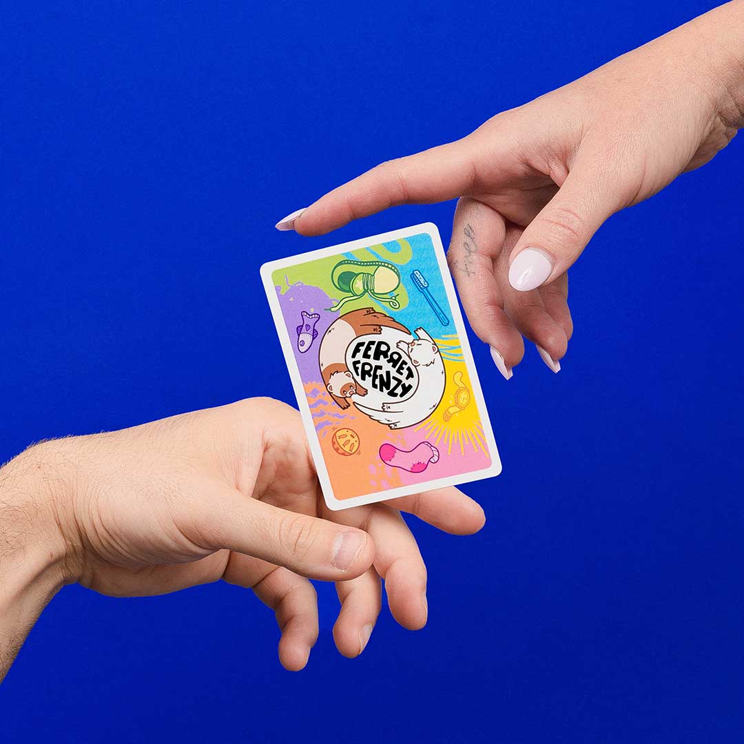 FERRET FRENZY is a fast, push-your-luck party game where you and your friends raid a house like mischievous ferrets, hoarding oddball treasures and daring each other to draw just one more card. It features 100 percent hand-drawn art, distinct iconography for a colorblind-friendly experience, and over 50 uniquely illustrated Things with playful flavor text. Every turn stays lively with interactive moments, no player eliminations, and optional non-slap rules for quieter tables. Play 2 players head-to-head or scale up with expansions to include more friends. Holographic cards and special edition sleeves await as Kickstarter exclusives. Back it on Kickstarter now.