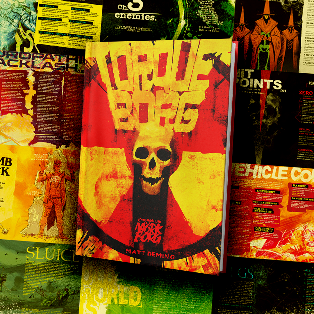 Torque Borg drags you into the WASTE, a rules-light, art-heavy TTRPG where radiation, rust, and roaring engines decide who lives and who is scrap. This 140+ page A5 book and PDF is standalone yet compatible with Mörk Borg, CY_BORG, and Wasteland Degenerates, so you can rip out its classes, tables, and setting for any table. Build a survivor from 6 unique classes, face 40+ illustrated enemies, and race through brutal vehicular combat with 36 mods. Manage the BLEED, trigger 12 psychic augs with risky backlashes, and watch the DOOMSDAY CLOCK tick toward midnight. Two starter scenarios, generators, factions, tech, and more are packed in. Now live on Kickstarter. Back this project