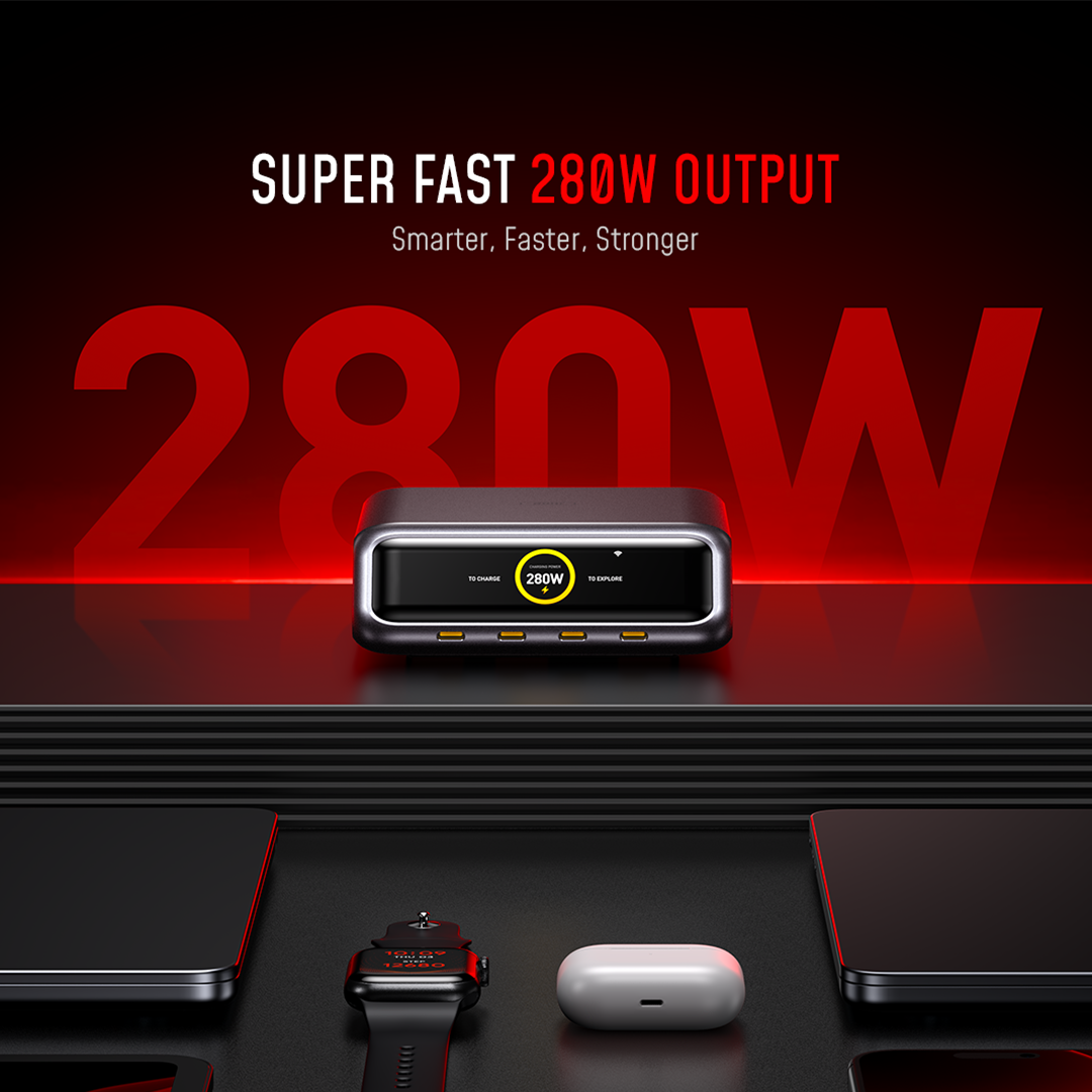 Push up to 280W, see live watts on the LCD, and switch modes for balanced or full-speed charging. ⚡