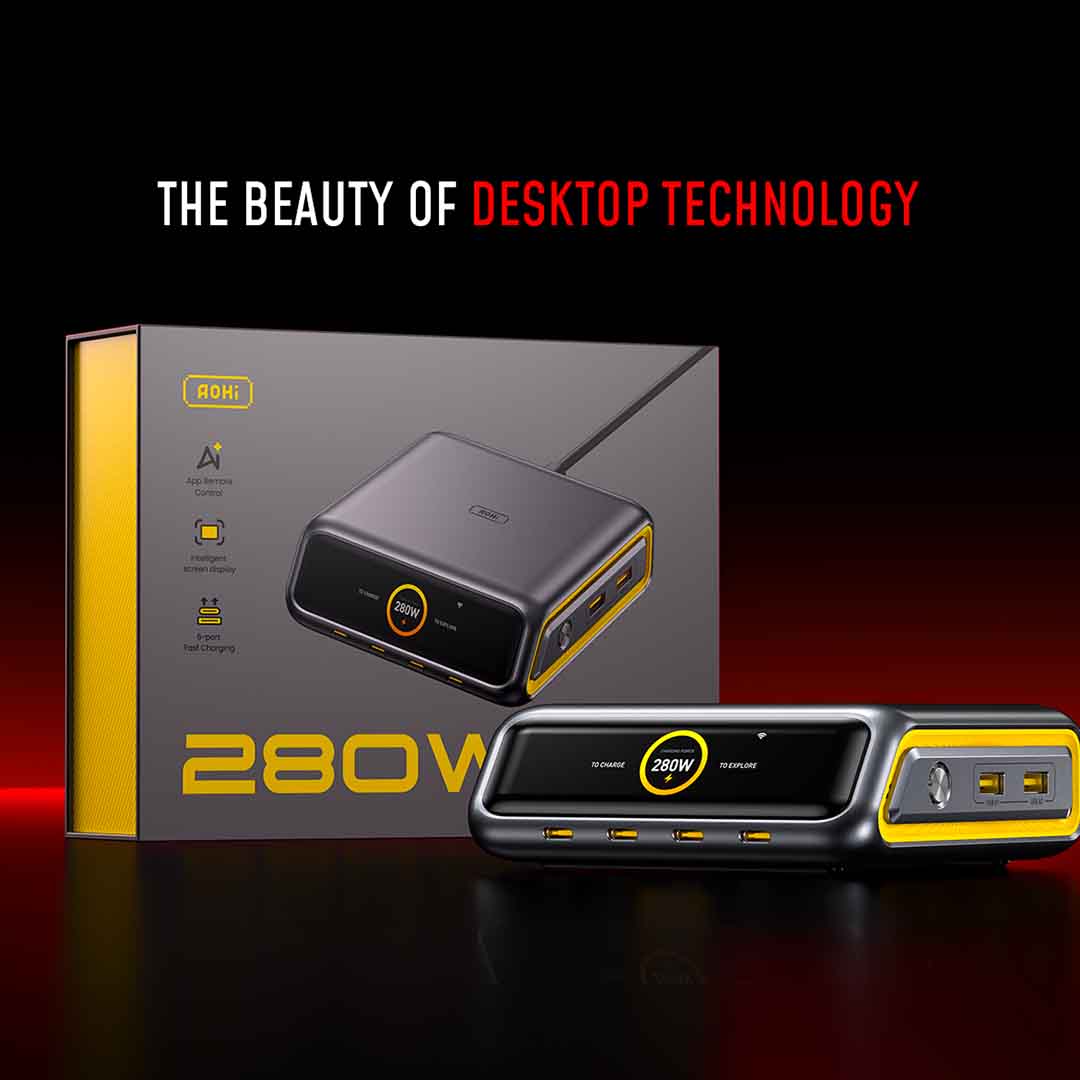 AOHi 280W GaN+ Desktop Charger brings serious power to a compact hub built for modern work. It delivers 280W total output to charge up to 6 devices at once, including laptops, tablets, phones, and accessories. Each USB-C port supports up to 240W single-port charging for demanding rigs. A real-time LCD shows per-port wattage, total power, and temperature so you always know what is happening. Choose Smart AI mode for balanced, safe distribution or switch to Turbo for full-speed output. Control it from your phone over Bluetooth or Wi-Fi, schedule sessions, and even switch to a clean clock display when you are off the grid. Make one charger do the job of many. Back it now on Kickstarter.