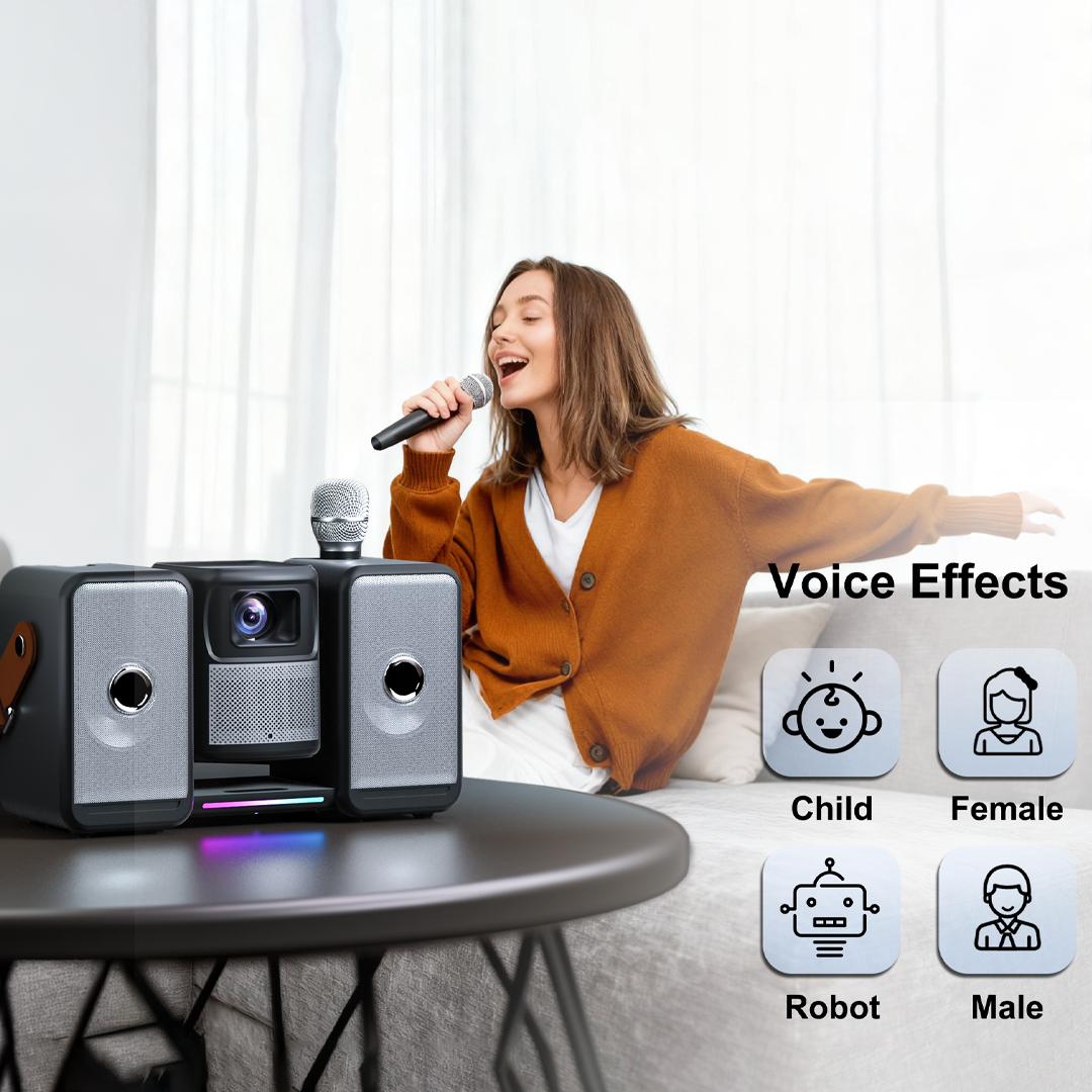 Native 1080P picture, 60W stereo, and dual wireless mics - 2s auto focus, up to 210 inches, and Android built in for instant play