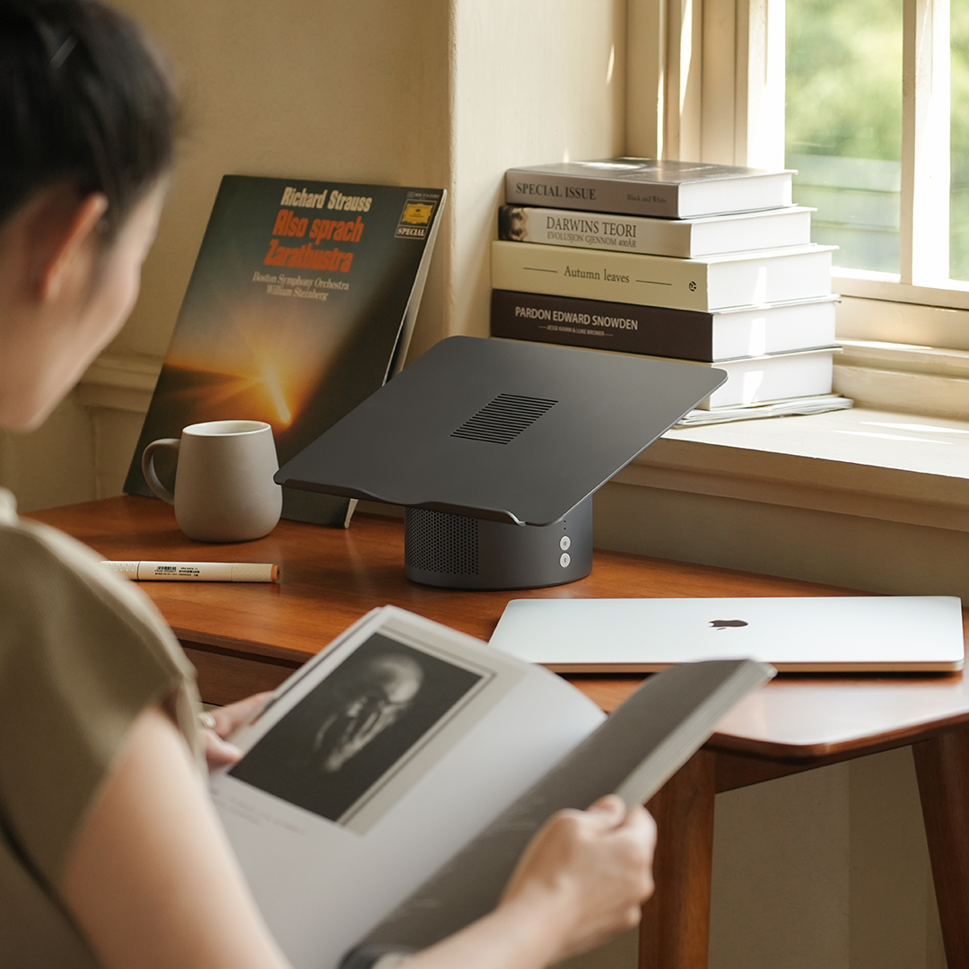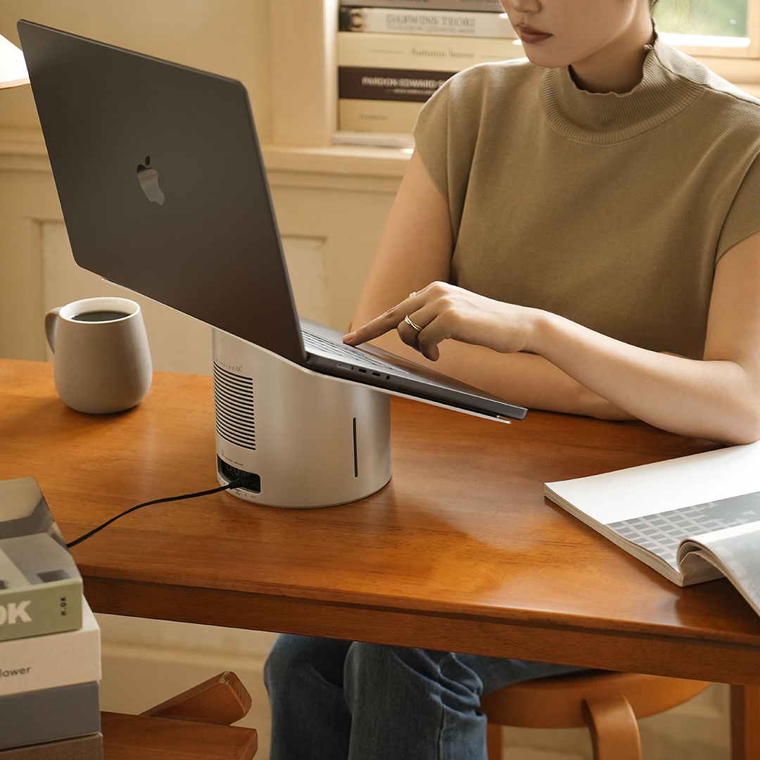 Mossion M1 brings cooling, sound, rotation, and ports together in a clean desk essential. A solid aluminum top board dissipates heat while a quiet fan helps your laptop stay cool at 22 to 28 dB. The fixed 15 degree tilt and a stable 360 degree rotating base make viewing and sharing easy. Built-in stereo speakers with a passive bass radiator deliver fuller audio without extra clutter. Simple controls for fan, volume, mute, and power keep things intuitive, and the integrated USB hub adds handy USB-C and USB-A ports. Anti-slip pads and cable management keep your setup neat. In the box: stand, USB-C cable, and power adapter. Back Mossion M1 on Kickstarter today.