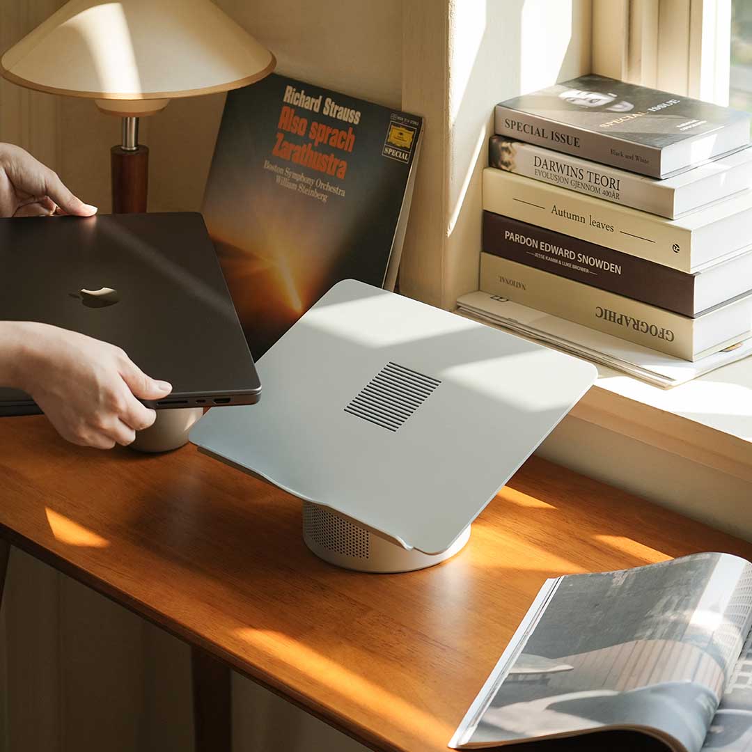 360 degrees rotation. Stereo sound. Keep your laptop cooler, add ports with the USB hub, and tidy cables.