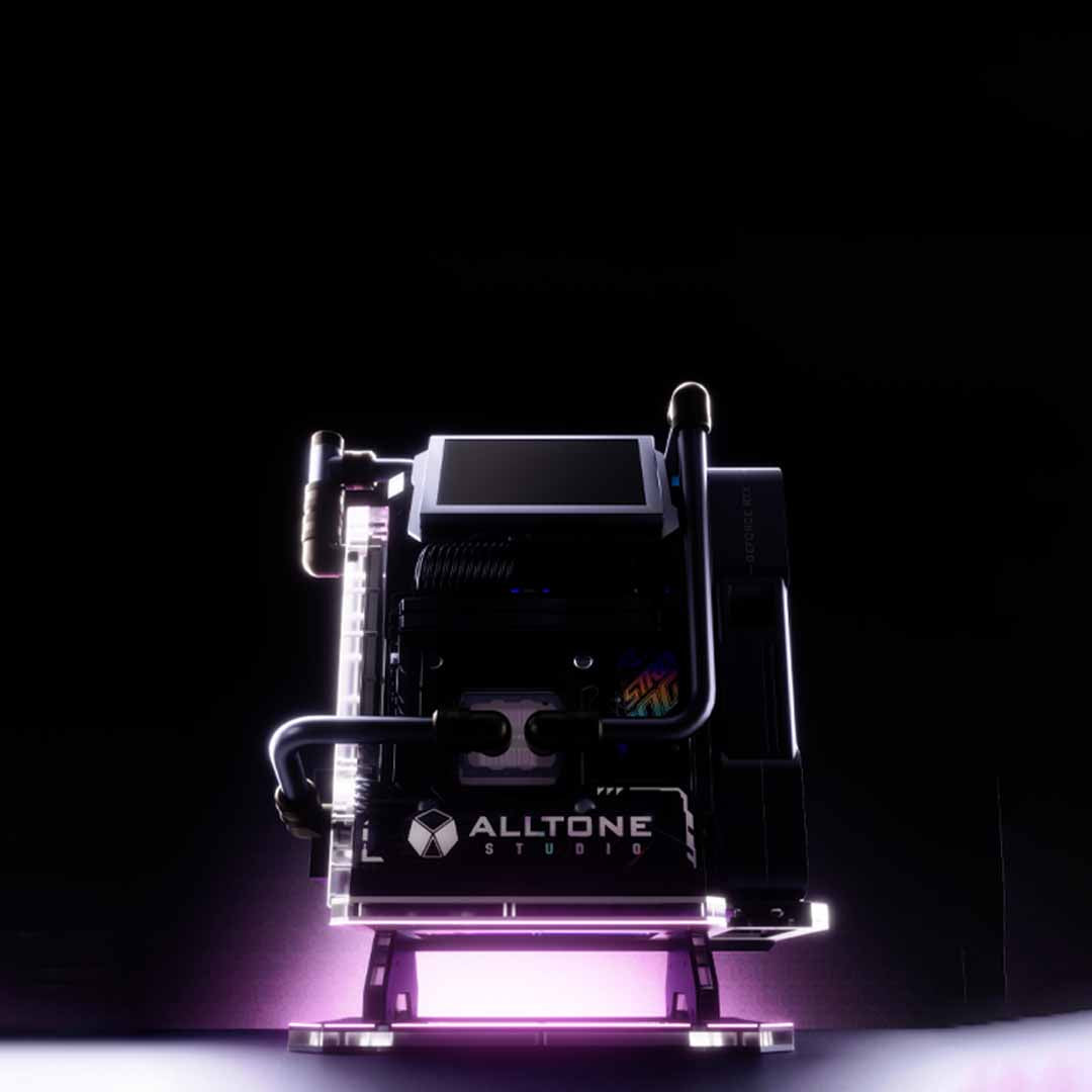 Open-air ARGB ITX chassis. Dual orientation, 5 inch tilting screen, endless lighting. Build desk art that roars.