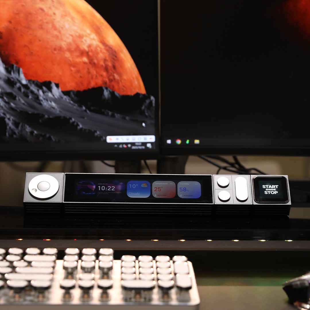 UltraBar X gathers your desk, PC, and smart home into one ultra-slim bar screen with snap-on modules you can touch, click, and glance at. The CoreBar powers a 21:9 display that uses 60% less desk space and anchors a magnetic ecosystem of DotKey mechanical keys, a precision DailKey dial, and flexible VivoKey tiles. The LineOS system runs a light-track interface with scene cards for work, gaming, music, or meetings, plus deep Home Assistant and Sonos support. A 38 degree tilt keeps viewing natural, while mmWave presence sensing can trigger scenes the moment you sit. Build on iOS, Android, or Windows, with macOS coming soon. Back UltraBar X on Kickstarter now.