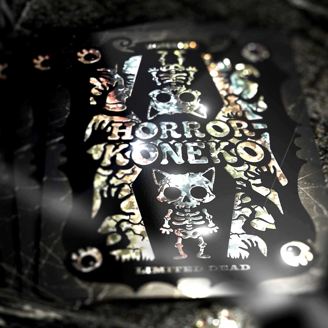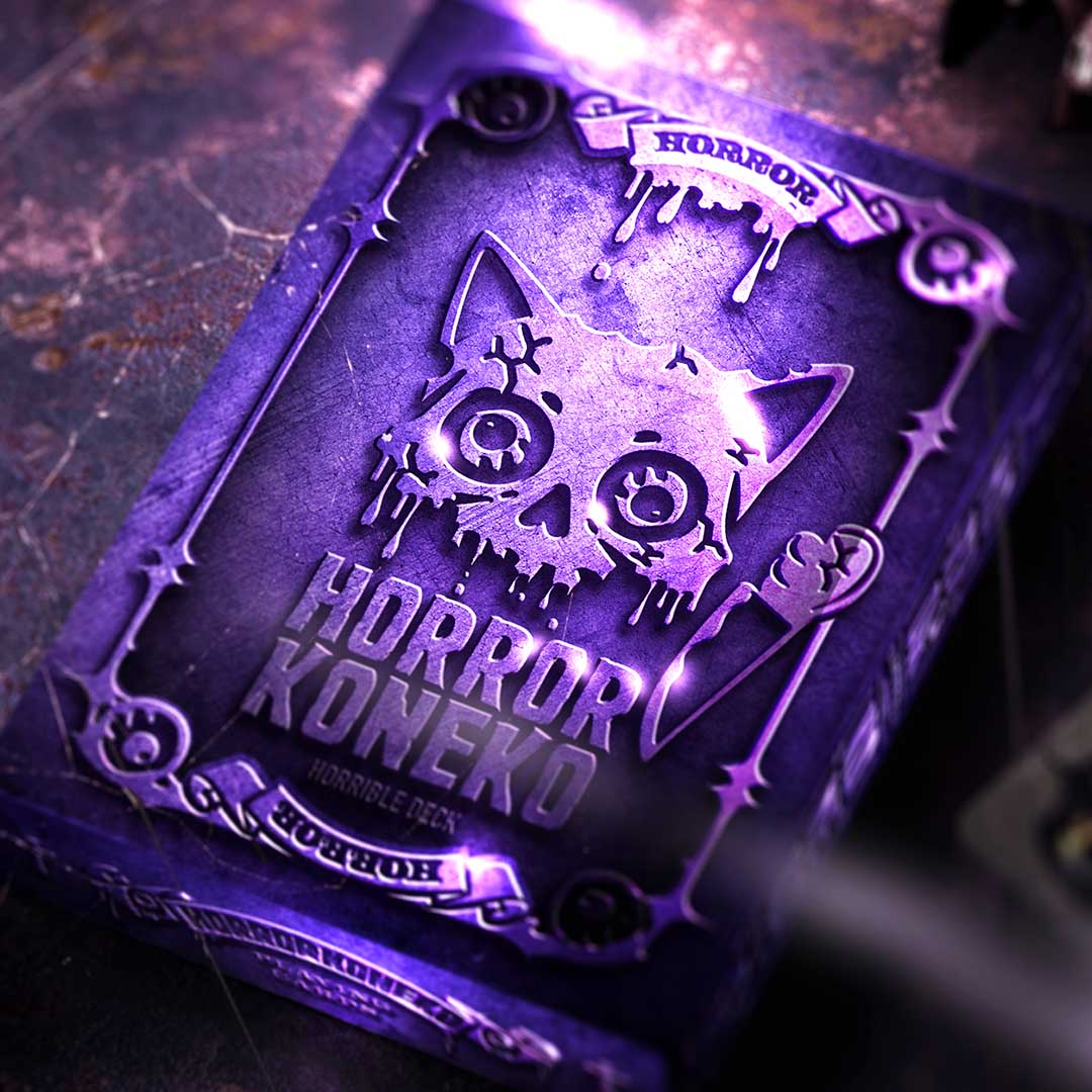 Horror Koneko Creepy Cute Playing Cards brings horror-movie thrills to your table with two collectible decks, Grave Neko and Killer Neko. The Grave Neko flipping tuck features deep 3D embossing with metallic foils and flips into a grave-shaped pop-up. The Killer Neko glowing tuck reveals a night-shadow effect and shatter-patterned purple foil gilding. Number cards hide 30+ classic horror quotes, while face cards showcase cute neko takes on famous horror icons in full foiled art. Card backs shimmer with a full foiled glitter dead-land design. Printed on poker-size 310gsm linen, black-core stock, and fulfilled via tracked shipping from Japan or Hong Kong. Back Horror Koneko on Kickstarter today.